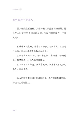 Chapter 1 如何成为一个美人 美人既能欣赏自己,又能与他人产生更深的联结,让 人在人际交往中更加淡定从容。那我们如何成为一个美 人呢? 1. 精神面貌良好,穿着得体恰当,自知自爱,认真对 待生活,感知和理解事物的方方面面。 2. 修炼自己的心性,内心有生机,有力量,情绪稳 定,眼里有光,对他人抱有同理心。 3. 不断地练习审美,提高审美力,在美中汲取更多的 养料,滋养自己。 后面的章节中我们还会详细讨论。现在你要知道的是, 你也可以成为美人。 028