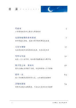 目 录 C o n t e n t s 代前言 3 小孩有权说出世上最让人难堪的话 友谊和爱情的老生常谈 7 哲学的最大贡献,是把不得不做的事说成美德 人生与理想 17 生活的答案不是纯粹的是或否,而是似是而非 写作与生活 30 我是一个三流作家,就该将内脏暴露在人群中吗 我不信上帝,真高兴 36 每代人都认为掌握了真理,历史却悄悄一个个推翻 想开一点 69 找一个舒服的姿势对付人生,心怀幽默感地躺好 苦难的真相 74 苦难不会使人品格高尚,只会让人更加自私和粗鄙 1 心有繁星,抬头皆是皓月