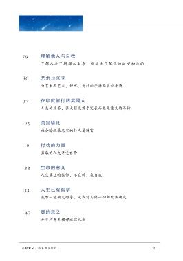 79 理解他人与自我 了解人要了解那人本身,而非去了解你的欲望和目的 86 艺术与享受 为艺术而艺术,好吧,为杜松子酒而杜松子酒 92 在印度修行的英国人 人类的痛苦,很大程度源于冗长而毫无意义的等待 105 美国错觉 社会阶级最忠实的仆人是财富 110 行动的力量 勇敢的人先享受世界 122 生命的意义 人生真正的信仰,不在神,在自我 133 人生已有哲学 我唯一能确定的事,是我对其他一切都无法确定 147 真的意义 并非所有真相都适宜说出 心有繁星,抬头皆是皓月 2