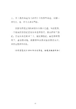 上,天主教的奇迹与《新约》中的那些奇迹,论据一 样充分,也一样令人难以置信。 宗教与真理之间的差别往往微不足道。当我想到, 一个虔诚的基督徒若是出生在摩洛哥,就是伊斯兰教 徒;若是出生在斯里兰卡,就是佛教徒。而在那种情 况下,基督教对他,就像那些宗教对基督教徒而言, 显然是荒谬不堪的。 (《作家笔记》1894 年日记节选,标题为编者所加) 16