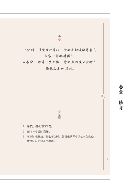 二 1 一念错,便觉百行皆非,防之当如渡海浮囊 , 2 勿容一针之罅漏 ; 3 万善全,始得一生无愧,修之当如凌云宝树 , 须假众木以撑持。 卷壹 修身 注释 1 浮囊:渡水用的气囊。 2 罅(xi3)漏:裂缝。 3 宝树:佛教语。指七宝之树,即极乐世界中以七宝合成的 树木。泛指珍奇的树木。 三