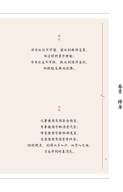 七 昨日之非不可留,留之则根烬复萌, 而尘情终累乎理趣; 今日之是不可执,执之则渣滓未化, 而理趣反转为欲根。 卷壹 修身 八 无事便思有闲杂念想否, 有事便思有粗浮意气否; 得意便思有骄矜辞色否, 失意便思有怨望情怀否。 时时检点,到得从多入少、从有入无处, 才是学问的真消息。 七