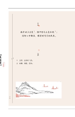 十五 2 1 拨开世上尘氛 ,胸中自无火炎冰兢 ; 消却心中鄙吝,眼前时有月到风来。 【菜根谭】 注释 1 尘氛:尘俗的气氛。 洪应明 2 冰兢:谨慎,恐惧。 一二