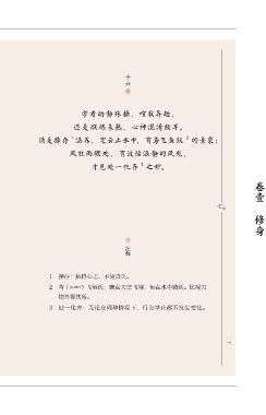 十六 学者动静殊操、喧寂异趣, 还是煅炼未熟、心神混淆故耳。 1 2 须是操存 涵养,定云止水中,有鸢飞鱼跃 的景象; 风狂雨骤处,有波恬浪静的风光, 3 才见处一化齐 之妙。 卷壹 修身 注释 1 操存:执持心志,不使丧失。 2 鸢(yu`n)飞鱼跃:鹰在天空飞翔,鱼在水中腾跃。比喻万 物各得其所。 3 处一化齐:无论在何种情况下,行为举止都不发生变化。 一三