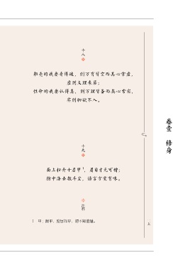 十八 躯壳的我要看得破,则万有皆空而其心常虚, 虚则义理来居; 性命的我要认得真,则万理皆备而其心常实, 实则物欲不入。 卷壹 修身 十九 1 面上扫开十层甲 ,眉目才无可憎; 胸中涤去数斗尘,语言方觉有味。 注释 一五 1 甲:颜甲,脸厚如甲,谓不知羞耻。