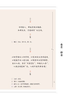 二二 白日欺人,难逃清夜之鬼报; 1 红颜失志,空遗皓首 之悲伤。 注释 1 皓首:白头,指年老。皓:白。 卷壹 二三 修身 以积货财之心积学问,以求功名之念求道德, 以爱妻子之心爱父母,以保爵位之策保国家, 3 2 1 出此入彼,念虑 只差毫末 ,而超凡入圣 , 4 人品且判星渊 矣。人胡不猛然转念哉! 注释 1 念虑:思虑。 一七 2 毫末:比喻极细微。 3 超凡入圣:达到登峰造极、超越凡俗的境界。 4 星渊:犹天渊。比喻差别大。