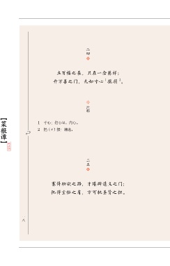 二四 立百福之基,只在一念慈祥; 2 1 开万善之门,无如寸心 挹损 。 注释 【菜根谭】 1 寸心:指心里、内心。 2 挹(y#)损:谦逊。 洪应明 二五 塞得物欲之路,才堪辟道义之门; 弛得尘俗之肩,方可挑圣贤之担。 一八