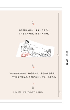 二六 融得性情上偏私,便是一大学问; 消得家庭内嫌隙,便是一大经纶。 卷壹 修身 二七 功夫自难处做去者,如逆风鼓棹,才是一段真精神。 1 学问自苦中得来者,似披沙获金 ,才是一个真消息。 注释 一九 1 披沙获金:拨开沙子挑选金子,比喻精选。
