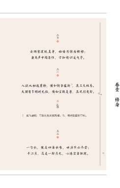 三十 云烟影里现真身,始悟形骸为桎梏; 禽鸟声中闻自性,方知情识是戈矛。 三一 卷壹 1 人欲从初起翦除,便似新刍遽斩 ,其工夫极易。 天理自乍明时充拓,便如尘镜复磨,其光彩更新。 修身 注释 1 新刍遽斩:草刚长出来就割掉。刍,喂养牲畜的草料。 三二 一勺水,便具四海水味,世法不必尽尝; 二一 千江月,总是一轮月光,心珠宜当独朗。