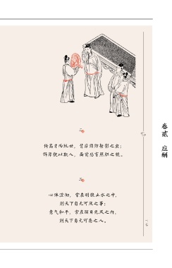 卷贰 二 应酬 倚高才而玩世,背后须防射影之虫; 饰厚貌以欺人,面前恐有照胆之镜。 三 心体澄彻,常在明镜止水之中, 则天下自无可厌之事; 意气和平,常在丽日光风之内, 二七 则天下自无可恶之人。