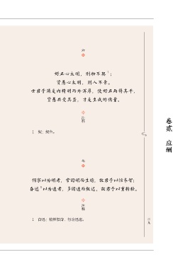 六 1 好丑心太明,则物不契 ; 贤愚心太明,则人不亲。 士君子须是内精明而外浑厚,使好丑两得其平, 贤愚共受其益,才是生成的德量。 卷贰 注释 1 契:契合。 应酬 七 伺察以为明者,常因明而生暗,故君子以恬养智; 1 奋迅 以为速者,多因速而致迟,故君子以重持轻。 注释 二九 1 奋迅:精神振奋,行动迅速。