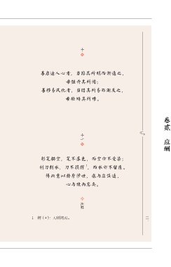 十 善启迪人心者,当因其所明而渐通之, 毋强开其所闭; 善移易风化者,当因其所易而渐反之, 毋轻矫其所难。 卷贰 十一 应酬 彩笔描空,笔不落色,而空亦不受染; 1 利刀割水,刀不损锷 ,而水亦不留痕。 得此意以持身涉世,感与应俱适, 心与境两忘矣。 注释 三一 1 锷(-):刀剑的刃。