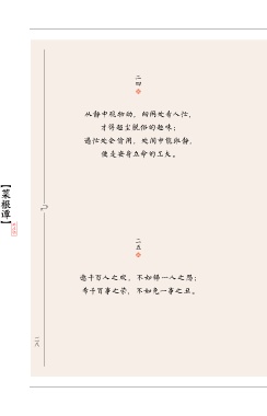二四 从静中观物动,向闲处看人忙, 才得超尘脱俗的趣味; 遇忙处会偷闲,处闹中能取静, 便是安身立命的工夫。 【菜根谭】 洪应明 二五 邀千百人之欢,不如释一人之怨; 希千百事之荣,不如免一事之丑。 三八