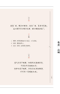 二六 1 2 落落 者,难合亦难分;欣欣 者,易亲亦易散。 3 是以君子宁以刚方见惮,毋以媚悦取容 。 注释 卷贰 1 落落:形容性格孤高与人难合,对人冷淡。 2 欣欣:喜悦的样子。 3 取容:取悦;取得别人的喜欢。 应酬 二七 意气与天下相期,如春风之鼓畅庶类, 不宜存半点隔阂之形; 肝胆与天下相照,似秋月之洞彻群品, 不可作一毫暧昧之状。 三九