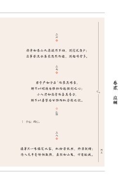 三六 持身如泰山九鼎凝然不动,则愆尤自少; 应事若流水落花悠然而逝,则趣味常多。 三七 卷贰 1 君子严如介石 而畏其难亲, 鲜不以明珠为怪物而起按剑之心; 应酬 小人滑如脂膏而喜其易合, 鲜不以毒螫为甘饴而纵染指之欲。 注释 1 介石:碑石。 三八 遇事只一味镇定从容,纵纷若乱丝,终当就绪; 四五 待人无半毫矫伪欺隐,虽狡如山鬼,亦自献诚。