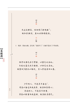 四五 1 先达笑弹冠,休向侯门轻曳裾 ; 相知犹按剑,莫从世路暗投珠。 注释 【菜根谭】 1 曳裾:拖着衣襟。古时用“曳裾王门”比喻在显贵门下作食客。 四六 洪应明 杨修之躯见杀于曹操,以露己之长也; 韦诞之墓见伐于锺繇,以秘己之美也。 故哲士多匿采以韬光,至人常逊美而公善。 四七 1 少年的人,不患其不奋迅 , 五〇 常患以奋迅而成卤莽,故当抑其躁心; 老成的人,不患其不持重, 常患以持重而成退缩,故当振其惰气。