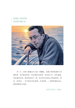 亲爱的,好好活着, 活得灿烂而好奇 每一天,我的心都像这片大海一样膨胀,充满了那份既痛苦又幸 福的爱,我宁愿用我的一切去换取这份爱。你在我心中,如此温顺, 如此被我珍视,就如同我自己一样,我已经无法停止对你的爱恋。将 来,在那边,一切可能会更加艰难。但亲爱的,一切都将很快过去, 新的相聚终会来临。 1949年7月5日,星期二