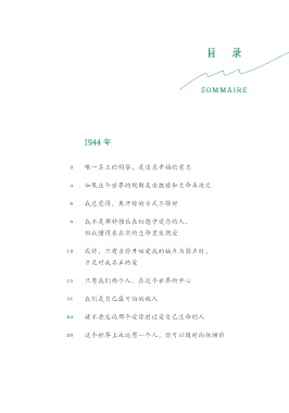 目 录 SOMMAIRE 1944 年 2 唯一真正的明察,是追求幸福的意志 4 如果这个世界的规则是由激情和生命来决定 6 我总觉得,离开你的方式不够好 9 我不是那种擅长在幻想中爱恋的人, 但我懂得在真实的生命里发现爱 12 或许,只有当你开始爱我的缺点与弱点时, 才是对我真正的爱 15 只有我们两个人,在这个世界的中心 21 我们是自己最可怕的敌人 24 请不要忘记那个爱你胜过爱自己生命的人 26 这个世界上永远有一个人,你可以随时向他倾诉