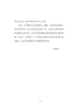 强大的力量,我不知道那会在什么时候。 不过,请不要因此而感到惊慌。我想一切都会好起来的。 因为有你的信,因为有我们之间的一切,更因为我始终对你 怀抱着深深的信任,以及我那执着地希望你能幸福的强烈渴 望。再见了,我的爱人。请不要忘记那个爱你胜过爱自己生 命的人,也请不要因此而对我感到任何怨怼。 阿尔贝 25
