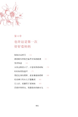 第4章 也许这是第一次 好好看妈妈 妈妈比花更美 · 156 姥姥的行李箱里装着对妈妈的爱 · 161 需要休息 · 165 在思念你的日子,在想见你的时候 · 170 妈妈如花般盛开 · 175 我们生活的模样,还有相爱的模样 · 180 有些事只有女儿才能做到 · 185 长大后,就懂得了爱妈妈 · 190 直到世界终结,我都是妈妈的女儿 · 193 004