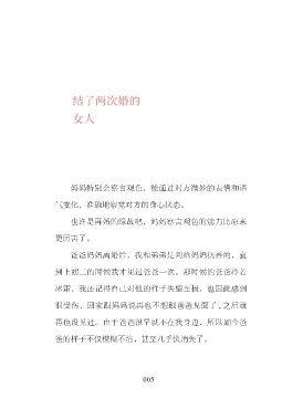结了两次婚的 女人 妈妈特别会察言观色,能通过对方微妙的表情和语 气变化,准确地察觉对方的身心状态。 也许是再婚的缘故吧,妈妈察言观色的能力比原来 更厉害了。 爸爸妈妈离婚后,我和弟弟是判给妈妈抚养的,直 到上初二的时候我才见过爸爸一次。那时候的爸爸冷若 冰霜,我还记得自己对他的样子失望至极,也因此感到 很受伤,回家跟妈妈说再也不想跟爸爸见面了 , 之后就 再也没见过。由于爸爸很早就不在我身边,所以如今爸 爸的样子不仅模糊不清,甚至几乎快消失了。 005
