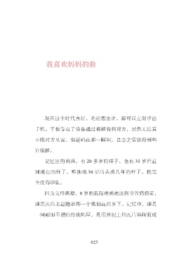 我喜欢妈妈的脸 现在这个时代真好,无论想念谁,都可以立刻拿出 手机、平板等电子设备通过视频看到对方,虽然无法真 正跟对方见面,但起码在那一瞬间,思念之情能得到些 许缓解。 记忆里的妈妈,有 20 多岁的样子,也有 35 岁后直 到现在的样子,唯独她 30 岁出头那几年的样子,我完 全没有印象。 因为父母离婚,8 岁的我跟弟弟被送到爷爷奶奶家, 那是庆尚北道醴泉郡一个极偏远的乡下。记忆中,那是 一间破旧不堪的传统韩屋,是用黄泥土和瓦片堆砌而成 025