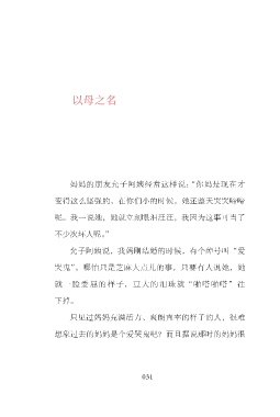 以母之名 妈妈的朋友允子阿姨经常这样说:“你妈是现在才 变得这么坚强的,在你们小的时候,她还整天哭哭啼啼 呢。我一说她,她就立刻眼泪汪汪,我因为这事可当了 不少次坏人呢。” 允子阿姨说,我妈刚结婚的时候,有个绰号叫“爱 哭鬼”。哪怕只是芝麻大点儿的事,只要有人说她,她 就一脸委屈的样子,豆大的泪珠就“啪嗒啪嗒”往 下掉。 只见过妈妈充满活力、爽朗直率的样子的人,很难 想象过去的妈妈是个爱哭鬼吧?而且据说那时的妈妈很 031