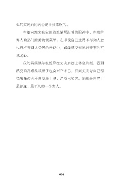但其实妈妈的内心是十分柔软的。 在望向跑来我家的流浪猫那温暖的眼神中,在端给 客人的热气腾腾的饭菜里,在即使自己过得不尽如人意 也看不得别人受苦的善良中,都能感受到妈妈特有的至 诚之心。 我的妈妈偶尔也想靠在丈夫肩膀上休息片刻,看到 漂亮的高跟鞋或裙子也会兴奋不已,听到丈夫夸自己漂 亮嘴角便会不自觉地上扬、洋溢出笑容。她就是世界上 最普通、最平凡的一个女人。 036