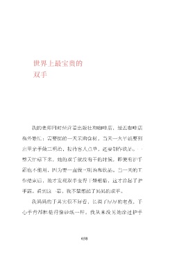 世界上最宝贵的 双手 我的老师同时经营着出版社和咖啡店,最近咖啡店 格外繁忙:需要提前一天采购食材,当天一大早就要到 店里亲手做三明治,接待客人点单,还要制作饮品。一 整天忙碌下来,她的双手就没有干的时候,即使有护手 霜也不能用,因为要一直做三明治和饮品。当一天的工 作结束后,她才发现双手变得干燥粗糙,这才涂起了护 手霜。看到这一幕,我不禁想起了妈妈的双手。 我妈妈的手其实很不好看,长满了厚厚的老茧,手 心手背都粗糙得像砂纸一样。我从来没见她涂过护手 038