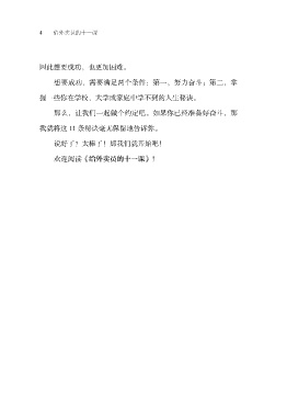 4 给外卖员的十一课 因此想要成功,也更加困难。 想要成功,需要满足两个条件:第一,努力奋斗;第二,掌 握一些你在学校、大学或家庭中学不到的人生秘诀。 那么,让我们一起做个约定吧。如果你已经准备好奋斗,那 我就将这 11 条秘诀毫无保留地告诉你。 说好了?太棒了!那我们就开始吧! 欢迎阅读《给外卖员的十一课》!