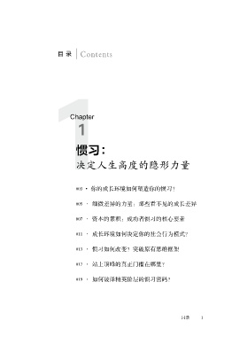 目录 Contents 1 Chapter 1 惯习: 决定人生高度的隐形力量 003 · 你的成长环境如何塑造你的惯习? 005 · 细微差异的力量:那些看不见的成长差异 007 · 资本的累积:成功者惯习的核心要素 011 · 成长环境如何决定你的社会行为模式? 013 · 惯习如何改变?突破原有思维框架 017 · 站上顶峰的真正门槛在哪里? 019 · 如何破译精英阶层的惯习密码? 目录 1